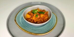 Once the habichuelas are boiling, reduce the heat and allow them to simmer until the potatoes are fork tender.